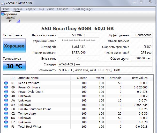 7. Для того что бы оценить состояние диска SSD воспользуйтесь прогнраммой Crystal Disk Info. Перед выкладыванием скриншотов Crystal Disk Info в меню Сервис>Дополнительно>Raw-значения выберите вариант "10 [DEC]" это несколько упростит восприятие информации.