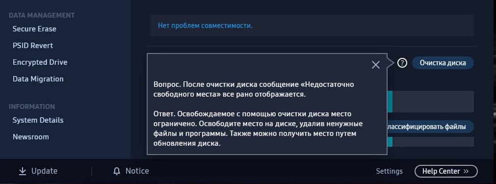 Приветствую. В samsung magician беспокоит странное уведомление "Недостаточно свободного места". см. фото. Я в принципе в курсе о необходимости свободного места на ССД для правильной работы.... но блин... там 230гб не занято из 930 доступных изначально. Не ужели этого мало?... или я что то не понимаю. Благодарю.
