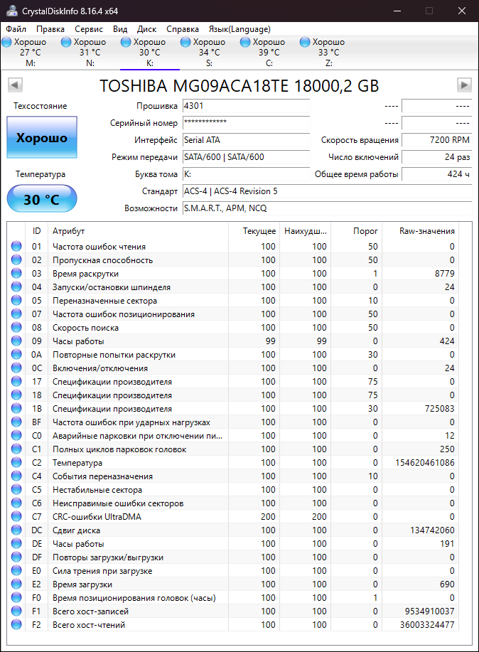 >>>При использовании Crystal Disk Info в меню Сервис>Дополнительно>Raw-значения выберите вариант "10 [DEC]" это несколько упростит восприятие информации утилиты форумчанами.<<<