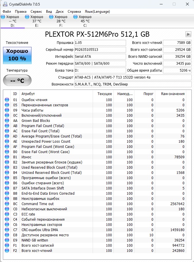 >>>При использовании Crystal Disk Info в меню Сервис>Дополнительно>Raw-значения выберите вариант "10 [DEC]" это несколько упростит восприятие информации утилиты форумчанами.<<<