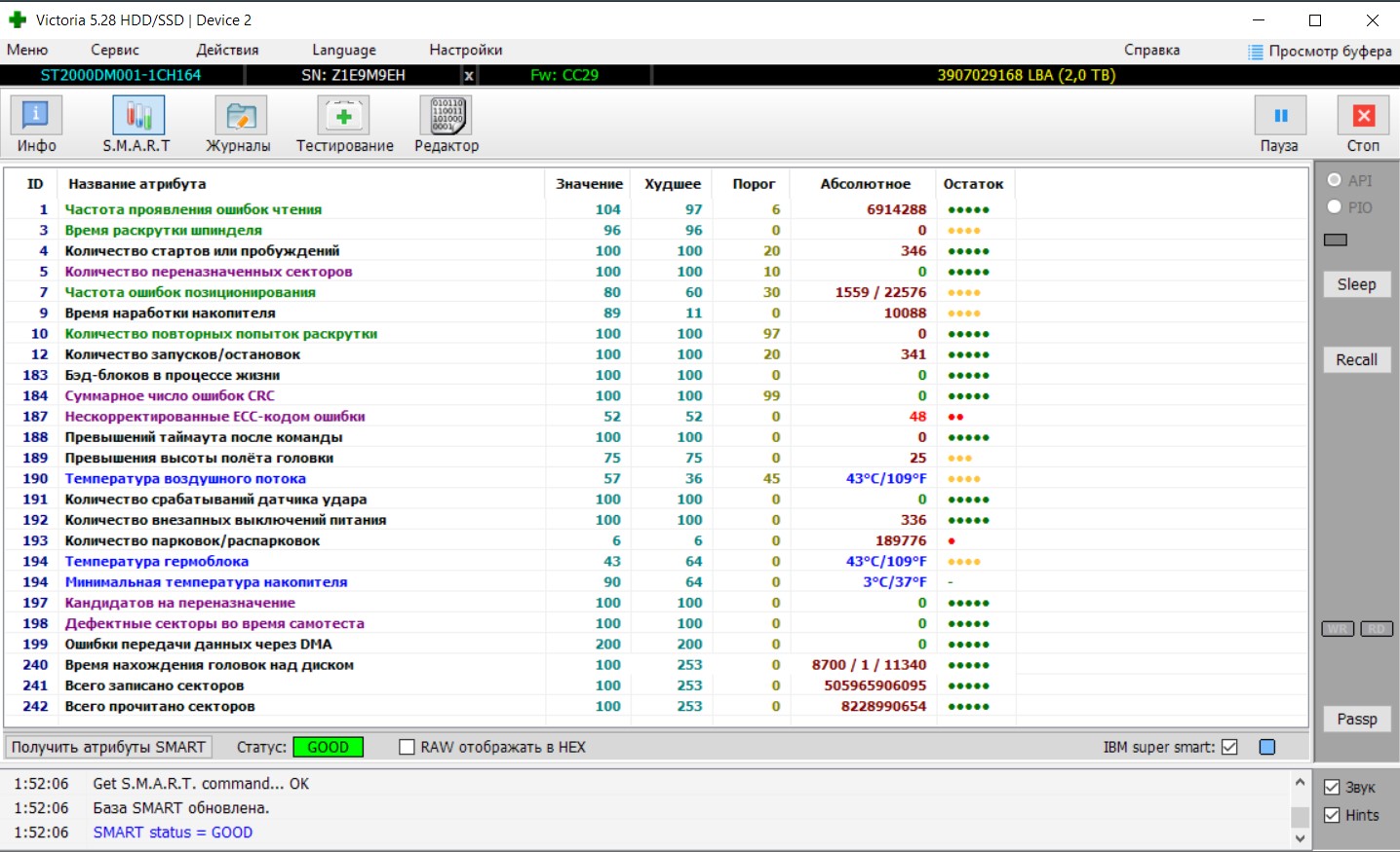 парни, гляньте мой 2тб hdd. Стоял в видеорегистраторе, начал глючить, отваливаться. Переставил в пк, отформатировал и прогнал тест в виктории. Умирает ?