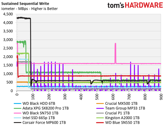 Orry Почитал обзоры и был удивлен что практически моментально скорость падает на SN550 при записи до уровня 450МБ/с. Есть какие-нибудь ССД, на которых скорость более стабильная?