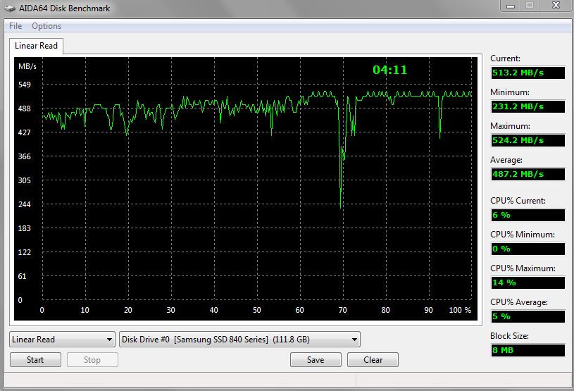 В общем с HDTune мутная ситуация касаемо того что конкретно он замеряет. Прогнал аиду Linear read. Интересный момент размах "пилы" оч. зависит от кол-ва работающих (с диском в том числе) приложений в памяти... Просто закрыл хром (более полусотни вкладок) с плеером и это заметно повлияло на рисунок графика, хотя полностью трей не вычищал.