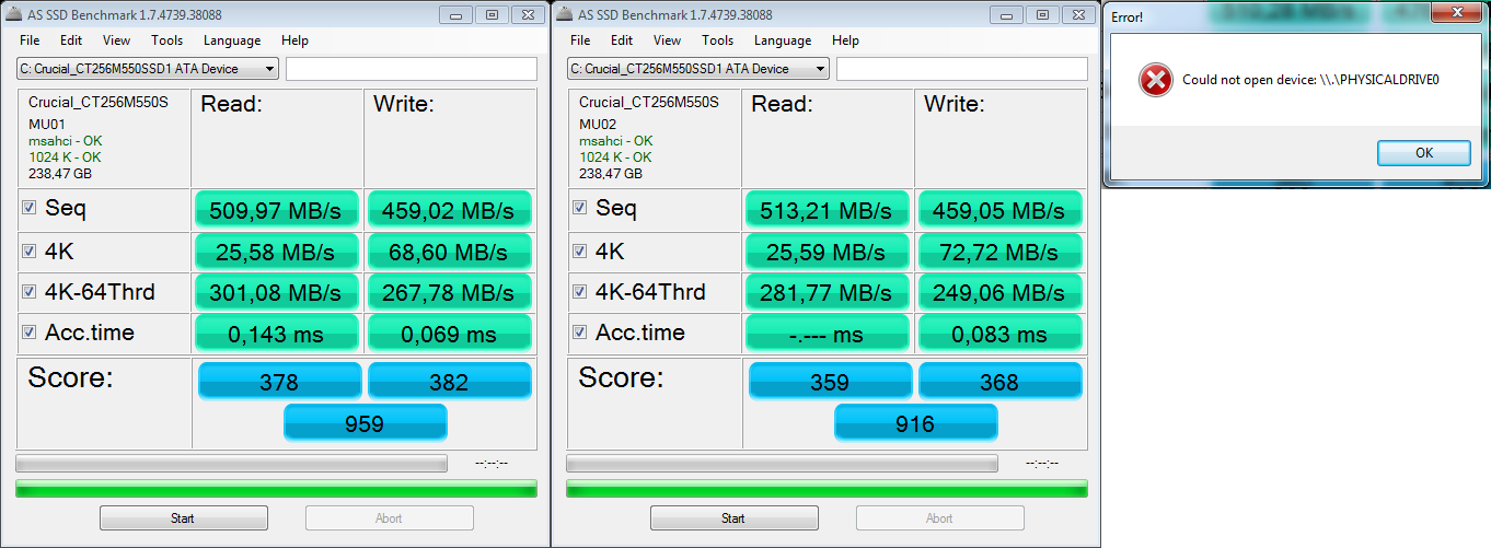 Возникла следующая проблема. Пользуюсь Crucial M550 256Gb. Стояла прошивка MU01 и программой AS SSD Benchmark все нормально проверялось. Обновился на новую прошивку MU02. Теперь одна из проверок вызывает ошибку и не проходит. Но дальше, щелкая на ОК для закрытия окна ошибки, проверка идет и завершается выдачей результата. Скриншоты ниже: