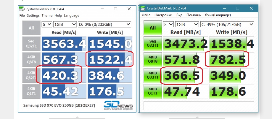 ребят ,есть у кого 970 evo 250gb что-бы скорость измерить. сравнил скорости с обзоров . есть большая разница . диск системный . тесты делал из под системы . может неправильно что то настроено. справа мой .