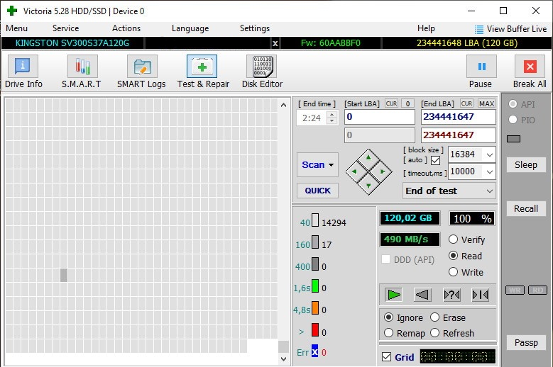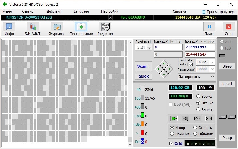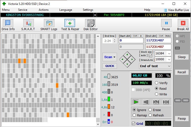 BlackCat71 неправильно. второй и третий вообще в порядке, а первый надо перезаписать - снять данные в образ, сделать secure erase и скинуть данные обратно. и картинка станет как на третьем если не как на втором. к ssd неприменимы методы, используемые для hdd, в частности попытка проверять викторией. при каждой записи по lba адресу данные сектора записываются в новое место флеша, а в какое именно место он попадает - запоминается в структурах транслятора lba адресов. так что хотя на картинке lba адреса идут подряд, в каком порядке они разложились по флешу - неизвестно. тем более что речь идет о ssd на базе sandforce, который сжимает данные при записи, то есть записываемый и считываемый сектор занимает во флеше обычно меньше места, чем сектор. так что если о чем первая картинка скана и говорит - так это о том, что на этом ssd давно не обновляли данные (со временем уровень заряда в ячейках записанного флеша снижается и чтение ухудшается - до следующей перезаписи).