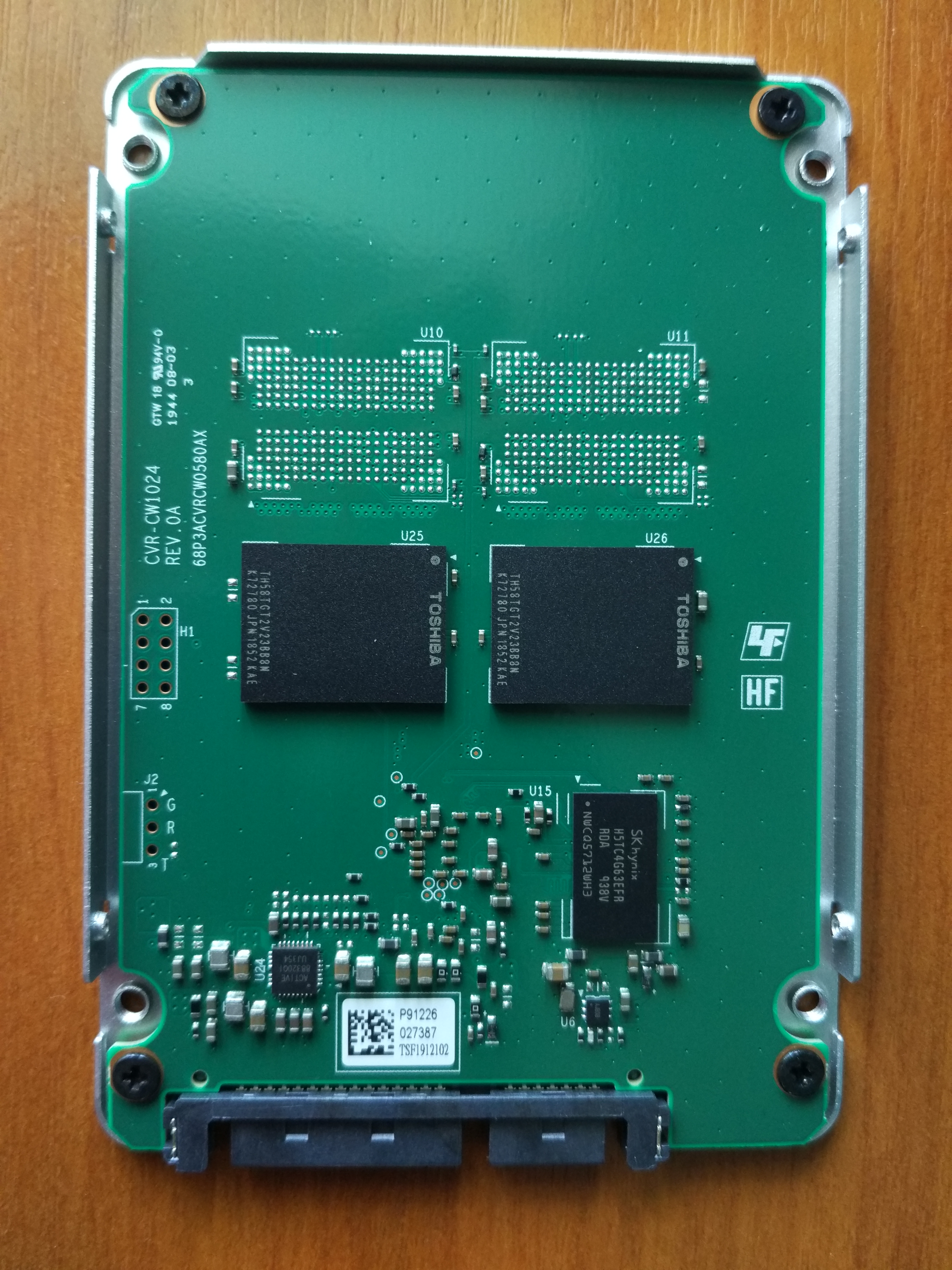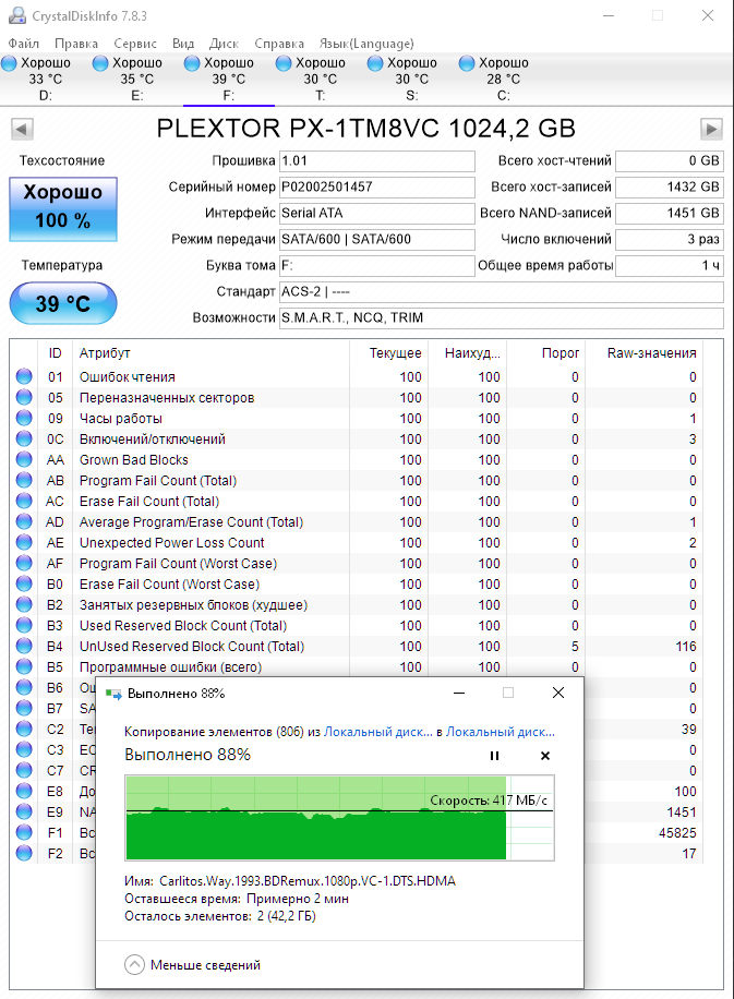 Приехал Plextor M8VC 1Тб. Давненько я не держал в руках столь добротный SSD)))Тяжёлый металлический корпус, полноразмерная (!) плата (сам текстолит очень толстый и тяжёлый), весь на винтах. Вообще впервые вижу такой дизайн платы. Аналогичный дизайн (судя по крепёжным отверстиям) имеет теперь и M8V на 512 Гб ( в ранних версиях стояла коротенькая платка, а-ля MX-500,545 и т.п.) Интересно организован Dram 2x512 (хотя удвоенный объём,когда 1Гб на 512 и 2 Гб на 1024 убрали) Немного модернизировал его, под контроллер положил пасты MX-4, результат, при прогоне на весь объём Аидой(падение скорости посл 9 Гб,видимо переключение на прямую запись), нагрелся только до 41 С))). Ну и скорость, меня вполне устраивает,порядка 415 Мб/c, а учитывая цену (брал в ОТ с бонусами,но там дороговато, есть предложения от 7300), просто отличный SSD (тот же KC600 12-13 тыр, 545-й где-то вообще за гранью 17-18-19). После R5SL960Гб (который ещё и 9400-11300) это вообще небо и земля!