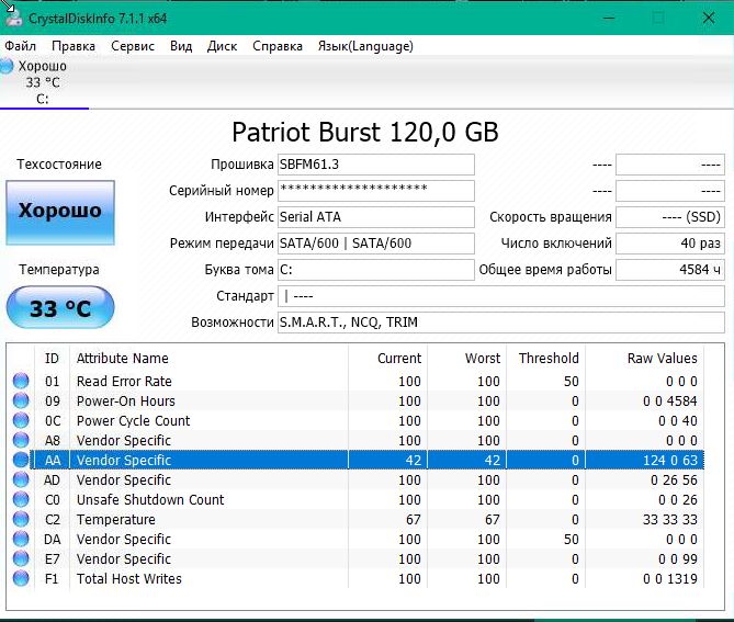 ========================================= Перед публикацией скриншотов Crystal Disk Info в меню "Сервис" >> "Дополнительно" >> "Raw-значения" выберите вариант "10 [DEC]". Это упростит восприятие информации. В меню "Сервис" ставьте галочку "Скрыть серийный номер".