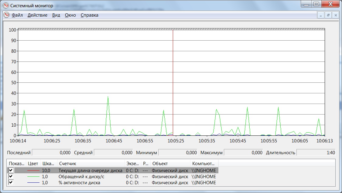 Reveal809, Пуск -> Панель управления -> Администрирование -> Системный монитор. Убираем текущие счётчики и добавляем из объекта Физический диск счётчики Текущая длинна очереди диска, Обращений к диску/с и %активности диска. Потом запускаем игру и по моменту наличия тормозов переключаемся на Системный монитор и смотрим как у нас занята дисковая подсистема. Средние значения нас не интересуют! Интересуют только текущие максимальные!