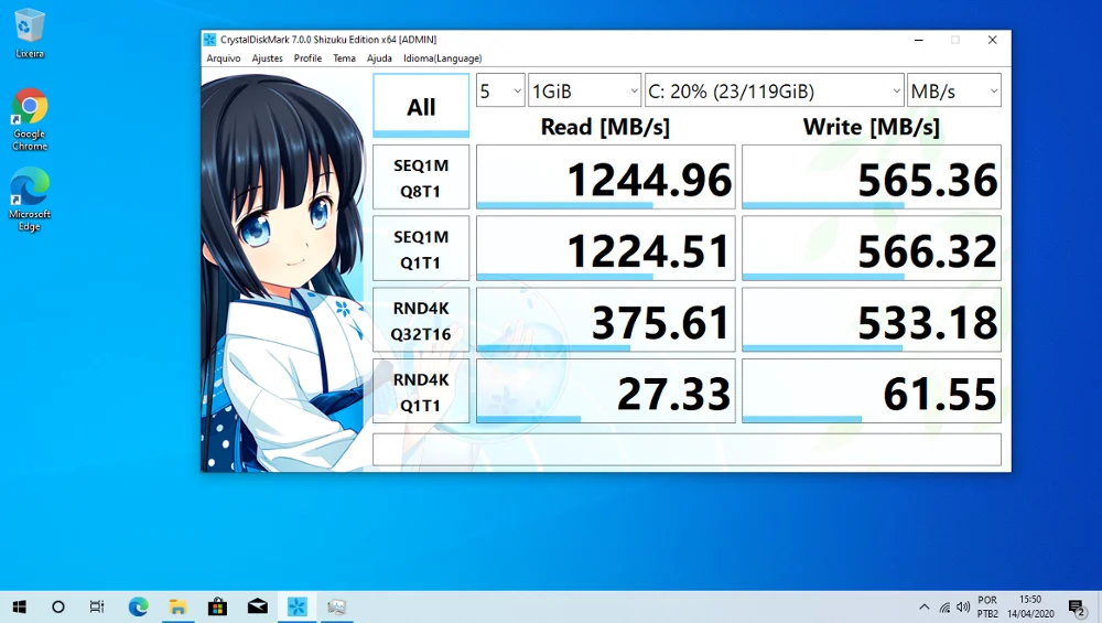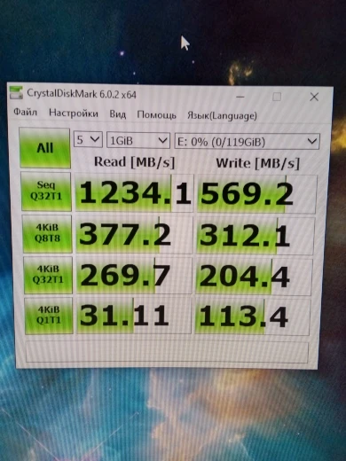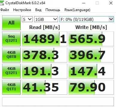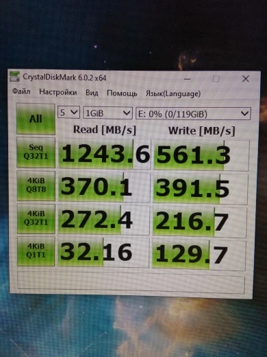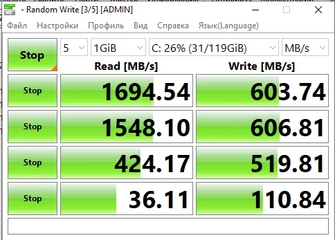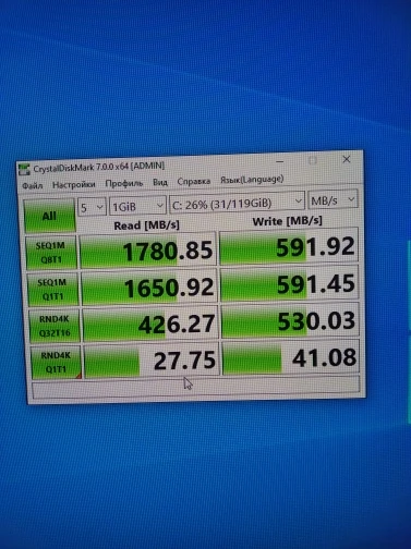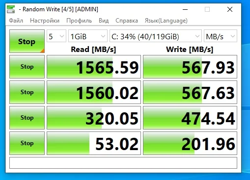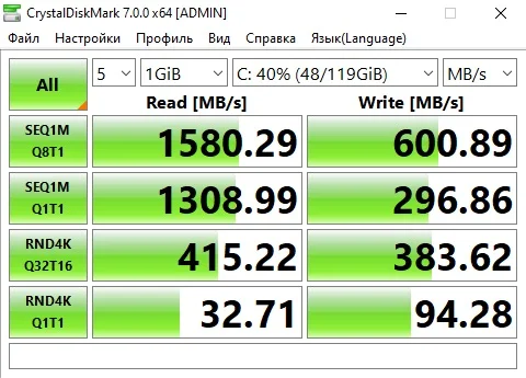Вычитал, что для таких дисков идеально подходит Win10. После этого через Rufus записал образ в (разметке GPT) Win10 Pro х64 для UEFI. Установил. Поставил все драйверы. Снова проверил скорости диска. Скорости так и остались (Запись ~ 560 MB/s, чтение ~ 980 MB/s). Меня это не устраивает, так как скорости ниже заявленных.