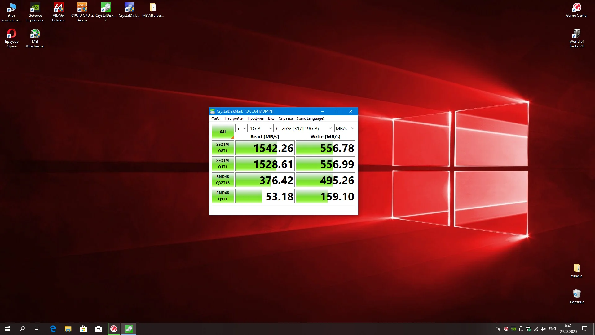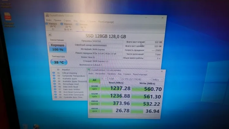 При установке Win7 изменил разметку диска на GPT, установил. Поставил все драйверы. Снова проверил скорости диска. Скорости так и остались (Запись ~ 560 MB/s, чтение ~ 980 MB/s). Меня это не сроило, так как скорости ниже заявленных.