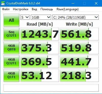 Сначала через UltraIso записал образ Win7 Максимальная х64, установил на новый диск. После установки всех драйверов проверил скорости диска через CrystalDiskMark (взят с официального сайта). Запись ~ 560 MB/s, чтение ~ 980 MB/s. Скорости меня не устроили.