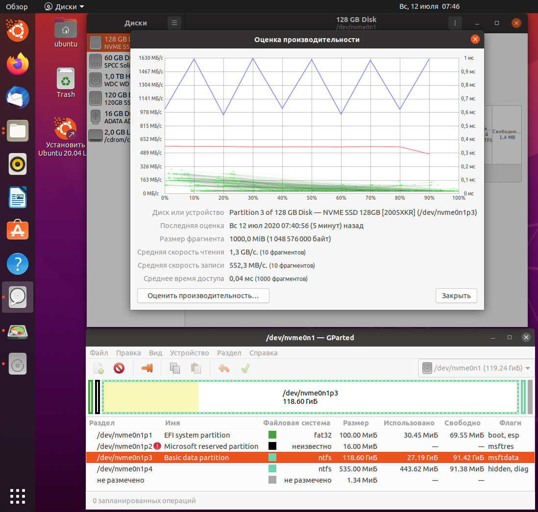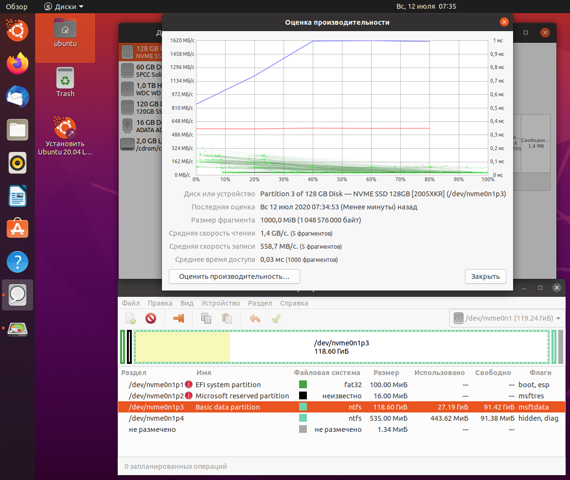Немного подумав, с официального сайта скачиваю образ Ubuntu 20.04 LTS. Записываю через UltraIso на флешку. Запускаю в режиме "пробовать". С помощью встроенных программ проверяю скорости диска. Запись ~ 1600 MB/s, чтение ~ 560 MB/s. Эти скорости близки к заявленным и меня полностью устраивают.