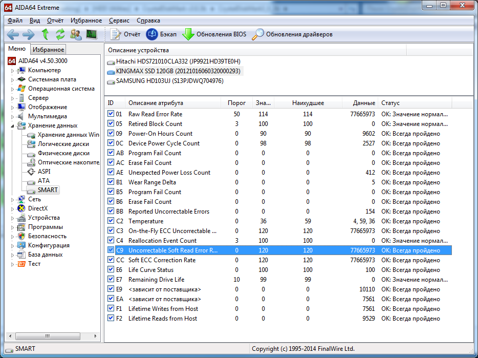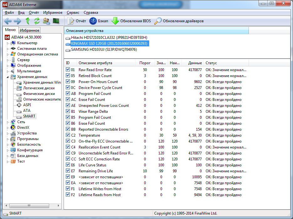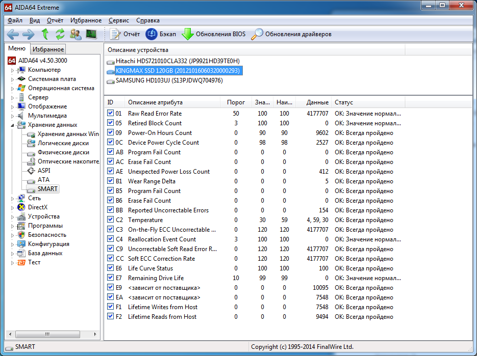 KINGMAX SSD 120GB (20121016060320000293) в журнале заметил ошибку очень часто появляющуюся Неверный блок на устройстве \Device\Harddisk0\DR0. И система заметно иногда подтупливать стала. В смарте по ХДД все параметры знаю. Но по ССД особо нигде нет инфы растолковывающей параметры. В АИДа64 заметил следующю ситуацию 01 Raw Read Error Rate 50 100 100 4170797 C3 On-the-Fly ECC Uncorrectable Error Count 0 120 120 4170797 C9 Uncorrectable Soft Read Error Rate 0 120 120 4170797 CC Soft ECC Correction Rate 0 120 120 4170797 эти параметры меняются очень быстро. Вот два скрина с разницей в 1 мин Это гарантийный случай? Гарантия на этот шлакодиск была 3г. В этом году закончится. Еще один скрин сделанный через минут сорок после того как я попытался сделать теневую копию, но она завершилась неудачей. Эти параметры увеличились в 2 раза!