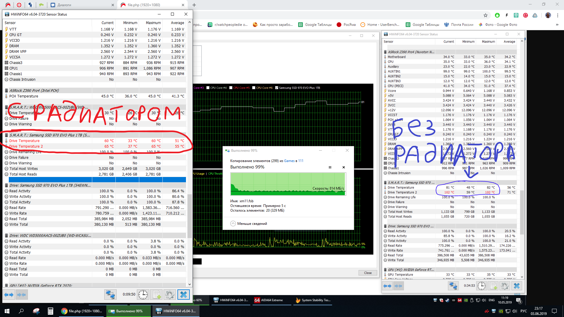 Поставил радиатор JEYI с али за 500р на свой 970 Evo Plus 1Tb, тестил копированием папками с играми на ~400-500Гб в сумме. Температура контроллера упала на ~40 градусов, памяти на 20-25.