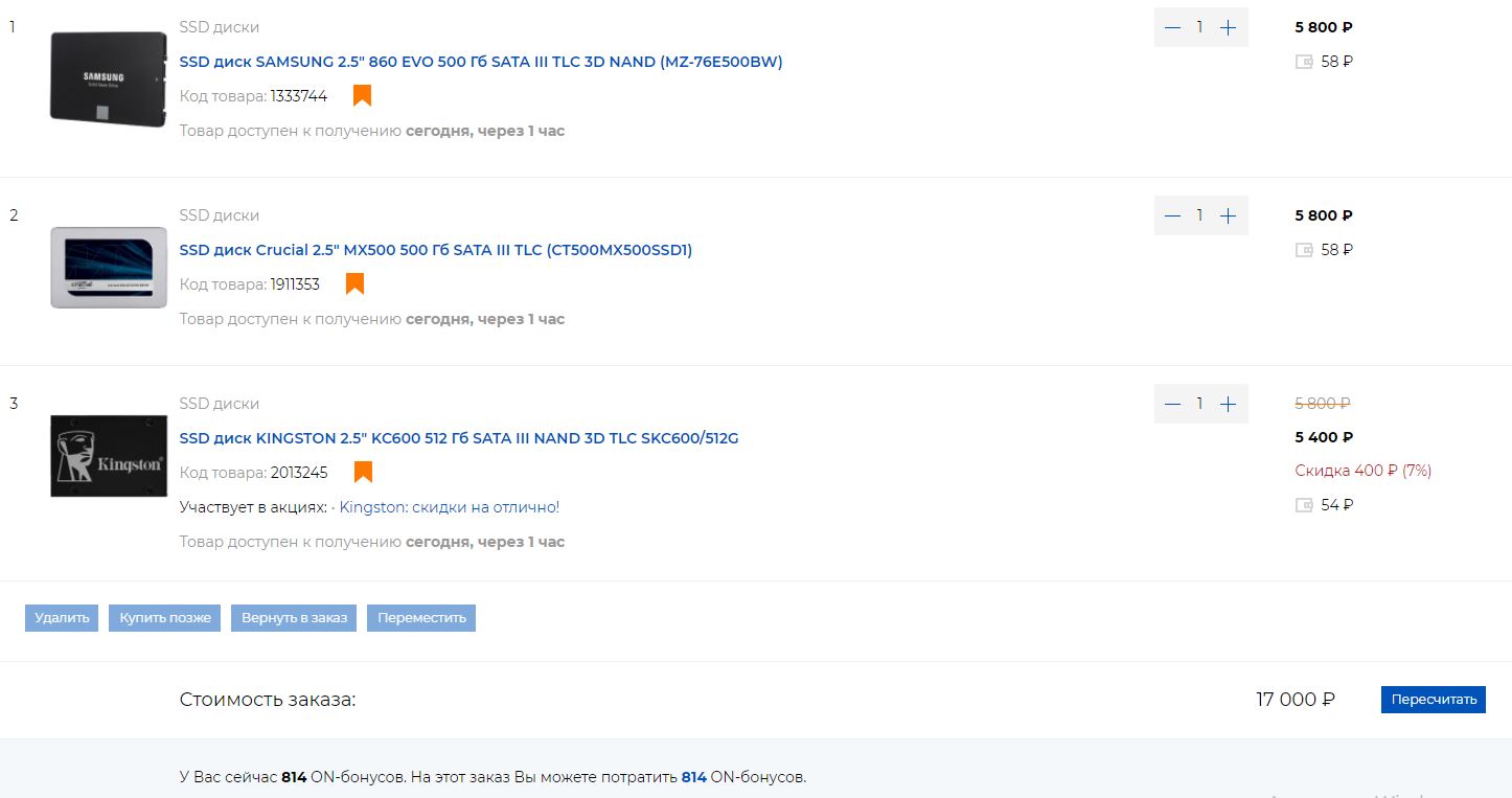 Аааа, муки выбора. Помогите определиться. В общем я отменил Kingston KC600 512gb который ко мне сегодня ехал, потому что на Samsung скидку сделали. Магазин онлайн трейд. Выбор между: 1. Samsung 860 EVO 500GB - 5800р 2. Crucial MX500 500GB - 5800р 3. Kingston KC600 512GB - 5400р