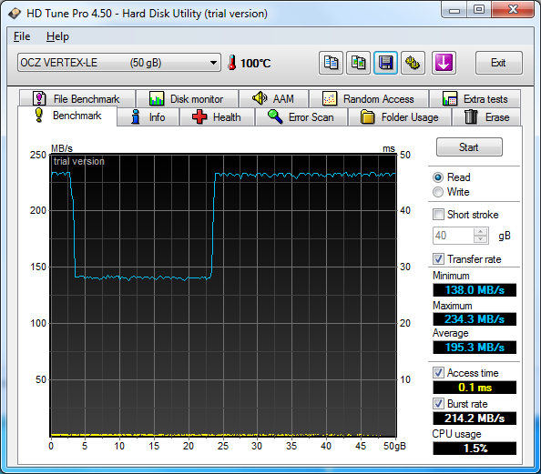 Cyborg скорее всего - Режим ИДЕ и поставь в свойствах ХД Тюне блок размером 1 МБ. и чтото слишком высокая загрузка проца... может драйверов каких то нет...