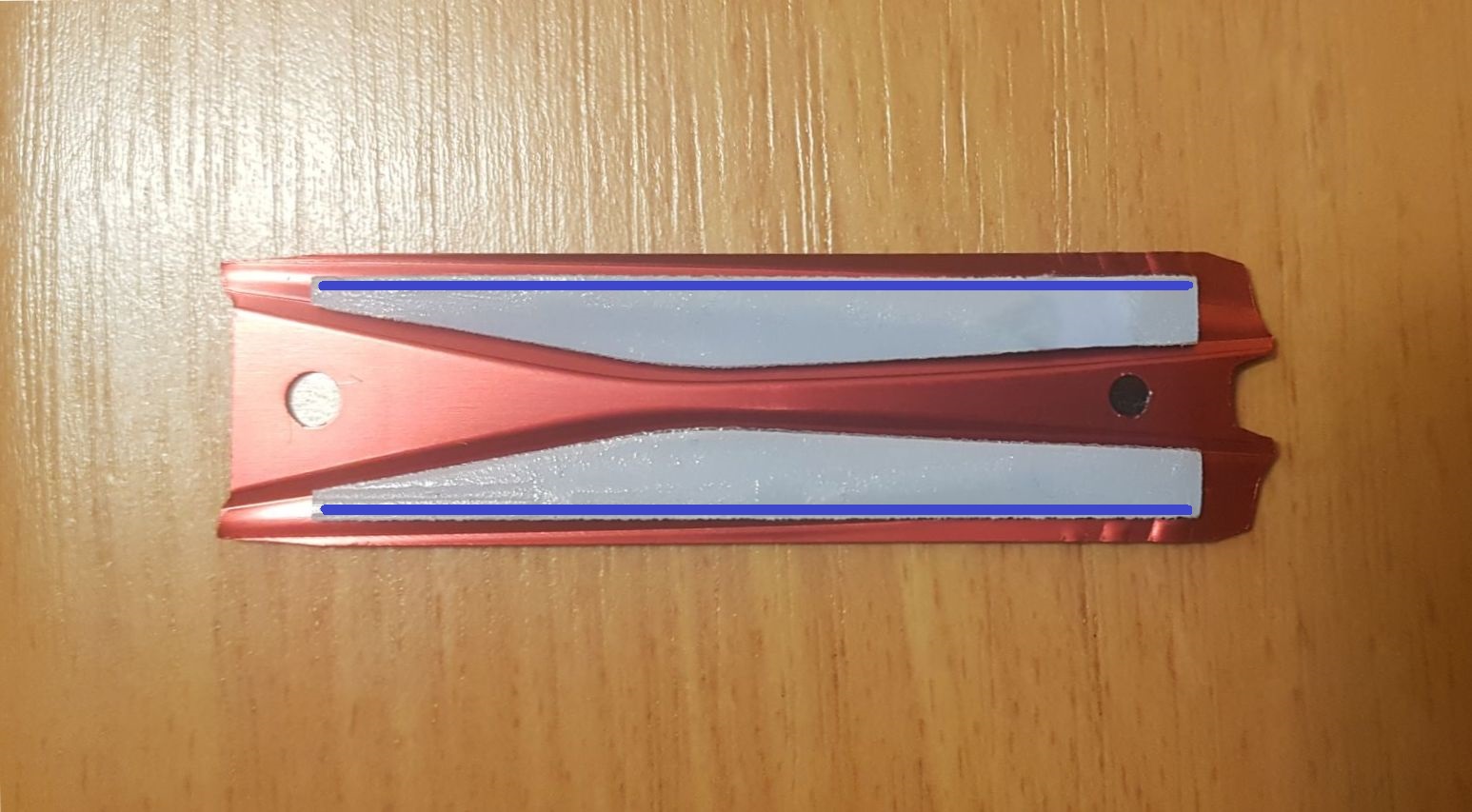 Короче, родной радиатор это просто издевательство, он соприкасается с чипами только вдоль внешних краёв скотча и наоборот препятствует охлаждению. На фото отметил синими линиями участки соприкосновения: