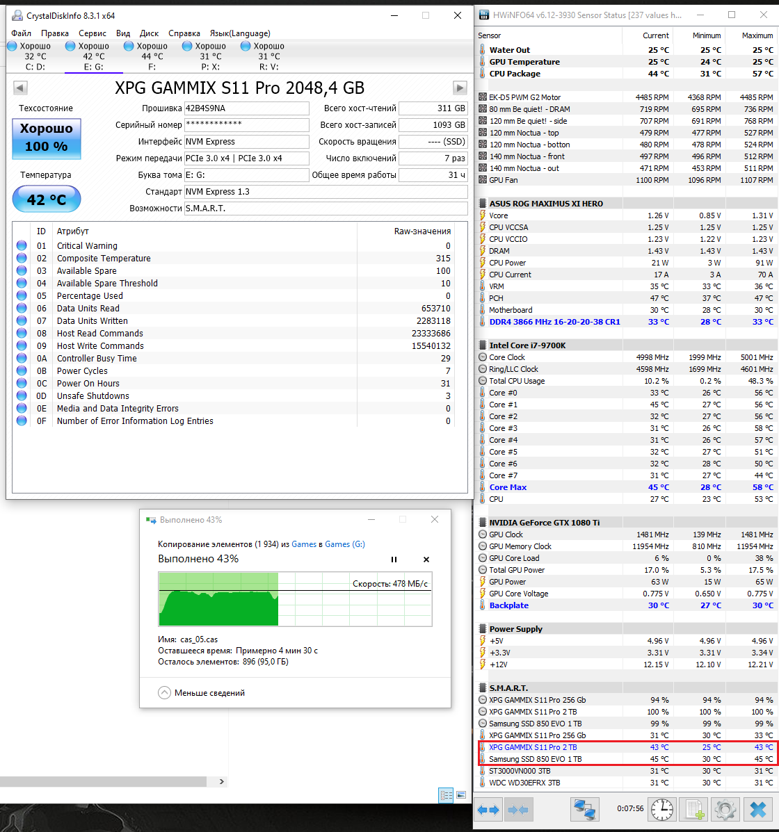 Копирую игры с Samsung SSD 850 EVO 1 TB на XPG GAMMIX S11 Pro 2 TB, что-то температура 75 °С не очень радует