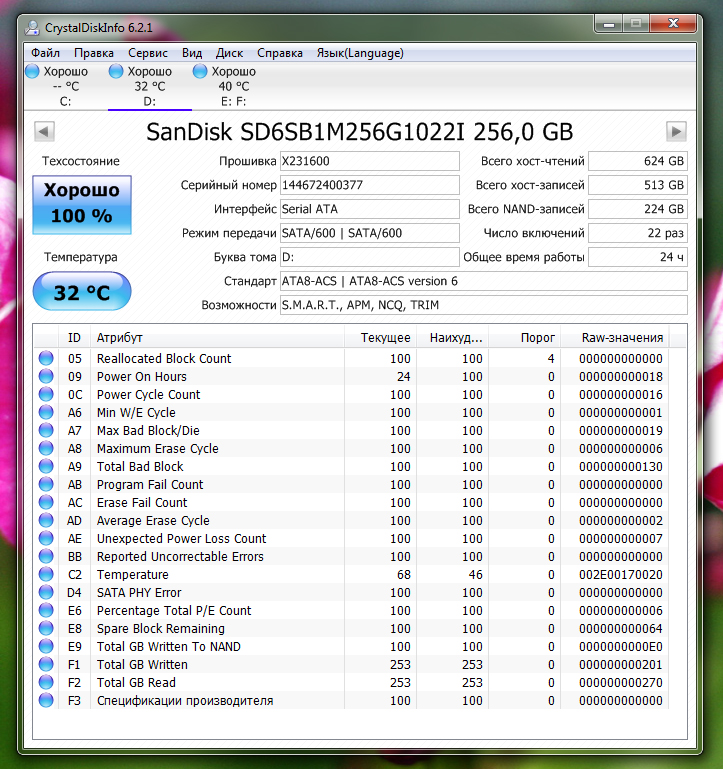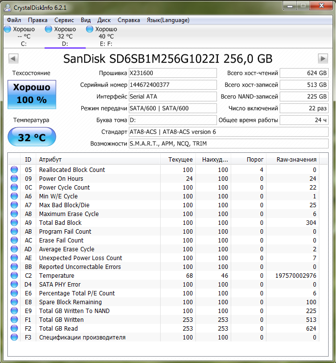 Atotarho, по смарту видно, что есть бэды. надо бы тулзу от сандиска поставить и посмотреть будет ли ругаться. если да, то можно предъявить для сц и попробовать обменять. если нет, то прогнать пару циклов записи. сбойные блоки будут заменены из резерва и можно пользоваться. но первое время нужно помониторить количество бэдов в динамике.