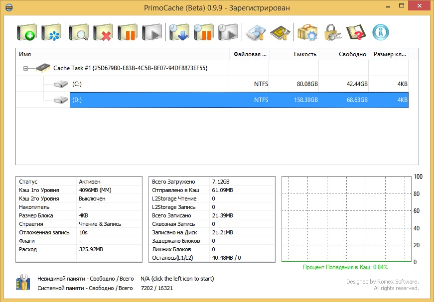 На диске D: не было никакого кэширования. Обьем 7,12GB - указывает про операции в оп. памяти. Пример: После игры Wolfenhtein ' Old Blood ' ( в течении 1 часа ) кэшировано : 1,96GB - 28,96%