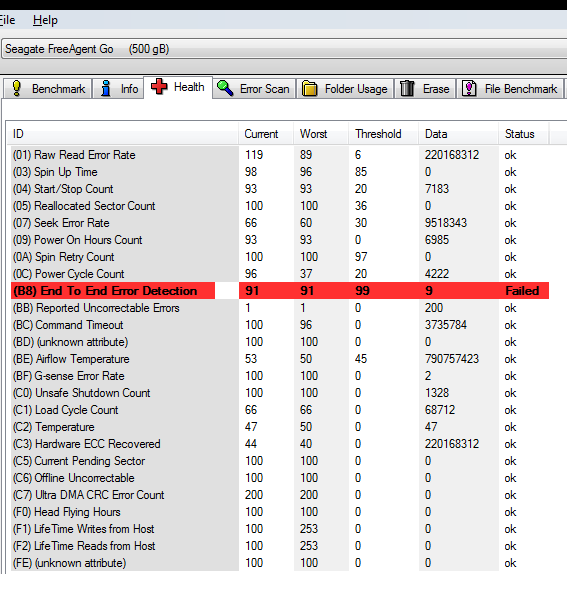 Привет всем. Имеется FreeAgent Drive 500Gb Model: ST9500420AS Firmware: 0001BSM2 Serial: 5VJ39YKG LBA: 976773167 Периодически при просмотре на ТВ видео с него диск отваливается и заново соединяется. СМАРТ прикладываю: