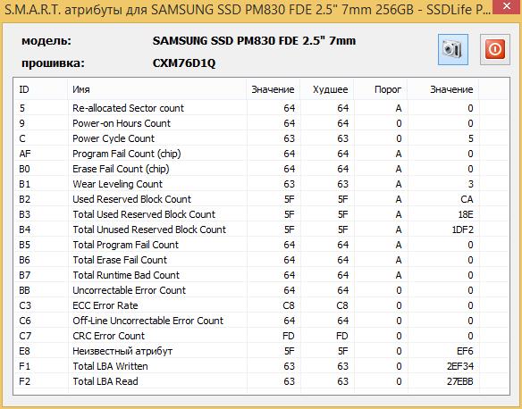 Прокомментируйте, пожалуйста, результаты SMART - смущают нулевое время работы при 3 циклах стирания (атрибут B1), ненулевой показатель атрибута B2 (хотя атрибут 5 нулевой).