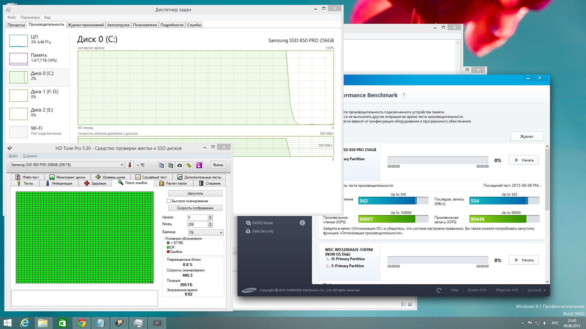 Затестил samsung 850 pro 256gb поставив на него windows 8, скорости просто охр*неть, после HDD у меня вот такие глаза О_О. Скорость при сканировании "поверхности" 472мб стабильно по всему диску. Hd tune чтение блоков по 4кб около 150мб/с или 170, забыл уже. 2.15гб образ андроида 5 с себя на себя копирует со скоростью около 532мб сек. Дрова на видяху поставились за 3-4 секунды о_О. (на hdd это минут на 5 минимум + перезагрузка системы(на ssd все практически мгновенно)) В общем эффект эйфории присутствует в полном объеме