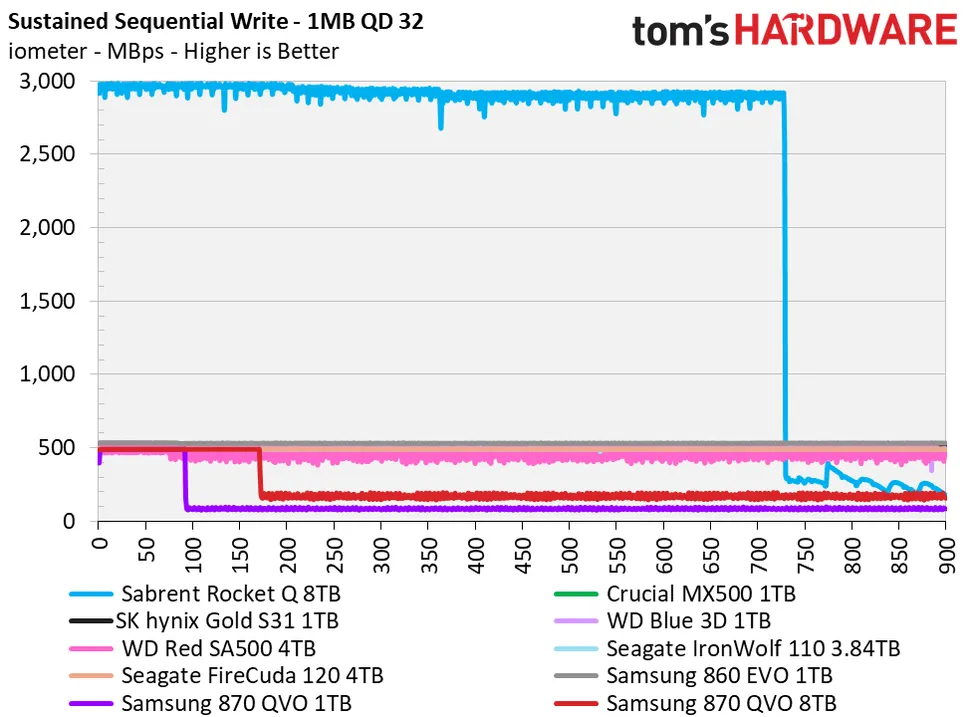 есть куча тестов qlc , у всех поголовно , в связи с особенностью памяти, после буфера скорость падает иногда до 10 мб/с - скорость флешки из начала 2000