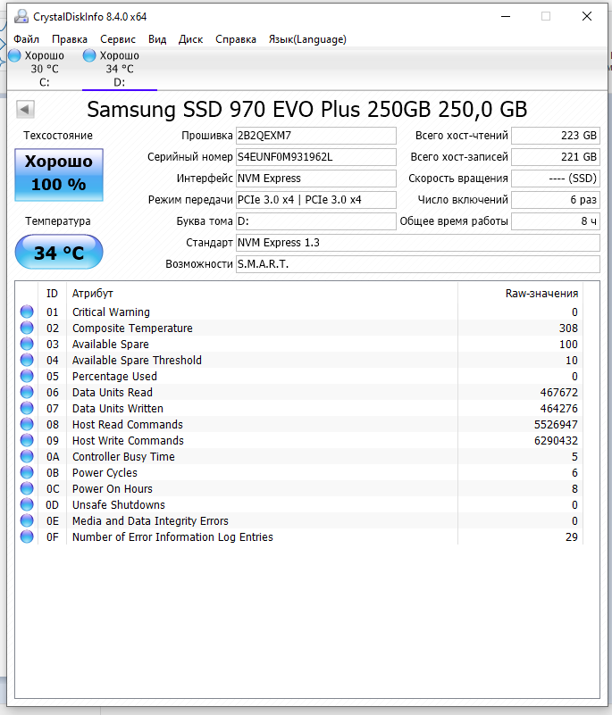 rallod Добавлю свои 5 копеек. В воскресенье купил новый 970 Evo+ 250Gb в Ситилинке, притащил домой, установил в МП Х470 и давай на него Вин10 устанавливать. После завершения установки, естественно, запустил CrystalDiskMark7_0_0g и увидел показатели, близкие к заявленным/тестам ) И ради интереса запустил CrystalDiskInfo8_3_2. Цифры в графе "Всего хост-записей" немного удивили - 172 Гб. Я от удивления выключил компьютер и лег спать На следующий день решил установить драйвера на чипсет с сайта производителя МП и параллельно погуглить в чем может быть проблема. Плюс система часто фризила (я это списал на то, что она качает/устанавливает обновления - оказалось, что ошибся). В общем, драйвера поставил, ничего не изменилось, кроме + 30 Гб за этот час. Magician пишет всё ок, прошивка последняя (думал, может проблема в ней и надо обновиться).