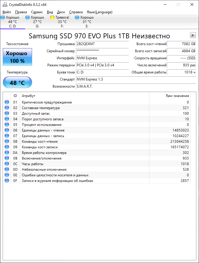 buchosi Привет. У меня в смарте 960 pro и 970 pro значения предпоследнего параметра 0E нулевые. 960 pro покупал дорого на старте продаж, тобиш давно. Вот на значения 0E наверное и стоит обратить внимание. В параметре 0F есть ошибки и много. Но тут скорее всего как у дисков Seagate регистрируются какие-то свои внутренние ошибки, которые никак не влияют на работу накопителя, причем появляться они стали сразу после установки в комп. Что касается проги HD Tune, то я не уверен, что она может корректно работать с NVMe -накопителями.