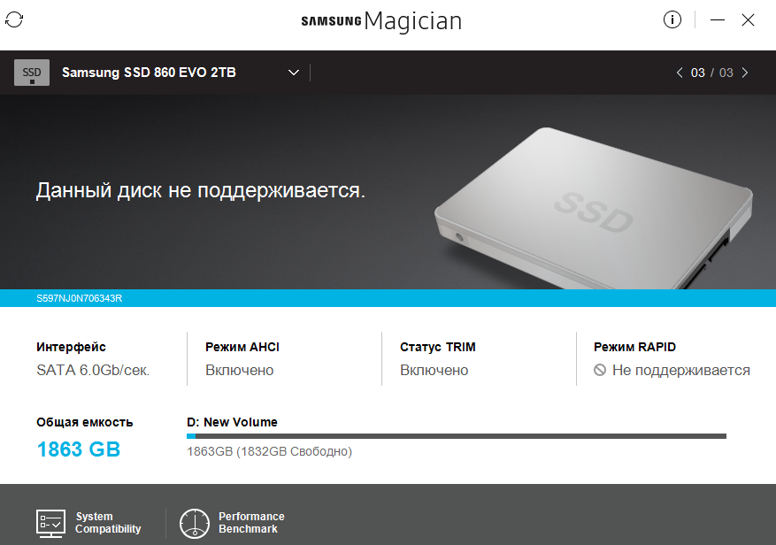 Получил недавно 860evo 2тб без корпуса, подключил заместо жесткого диска, чтобы проверить, но samsung magician пишет, что не поддерживает его. В чем может быть дело?