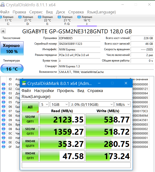 Взял под систему Gigabyte NVMe 128GB GP-GSM2NE3128GNTD, ибо 500Гб барракуда 120 для винды слишком жирно. Пока сказать особо нечего, кроме того, что клонировался с десяткой без проблем, ну и ледяной без всяких радиаторов(еще бы он грелся при такой записи )