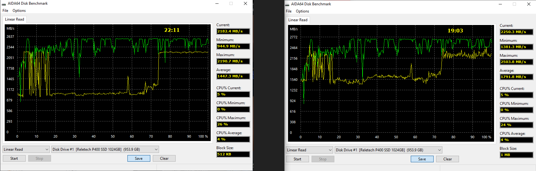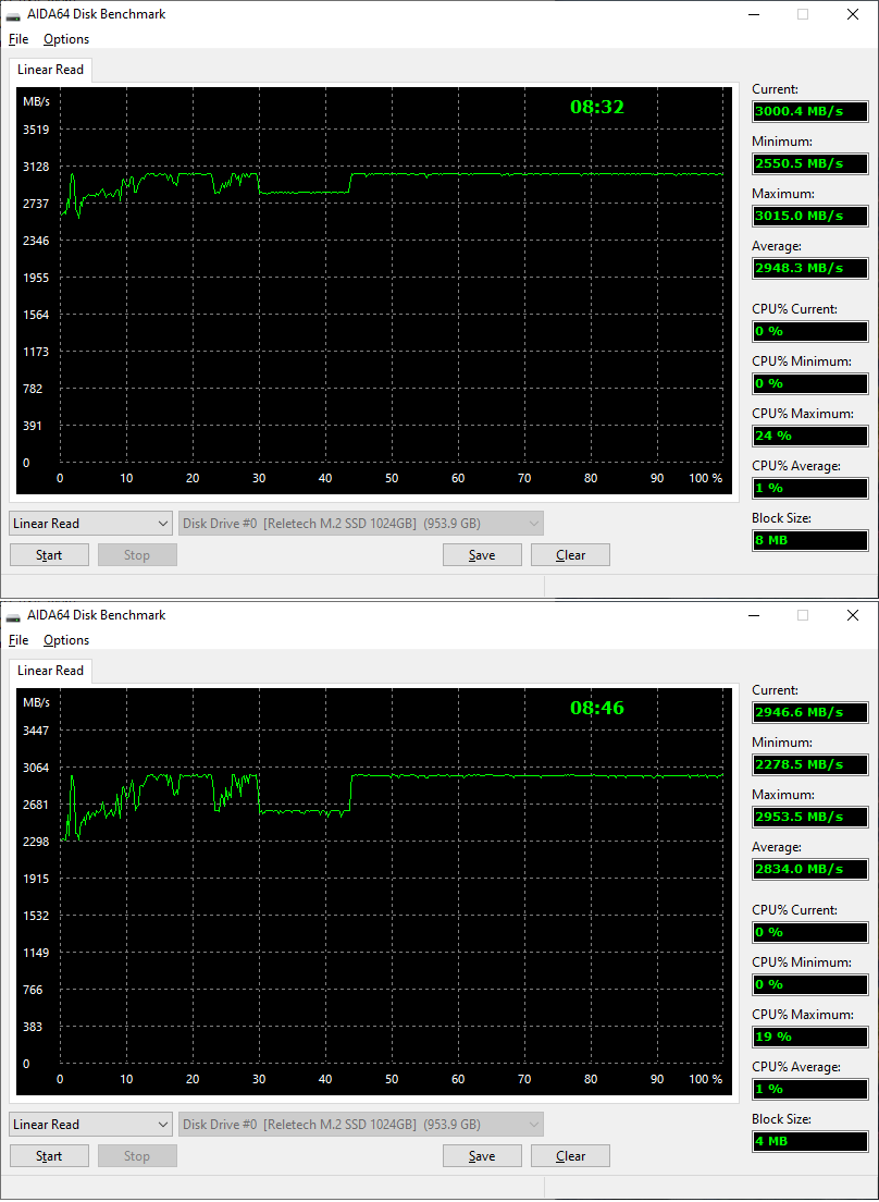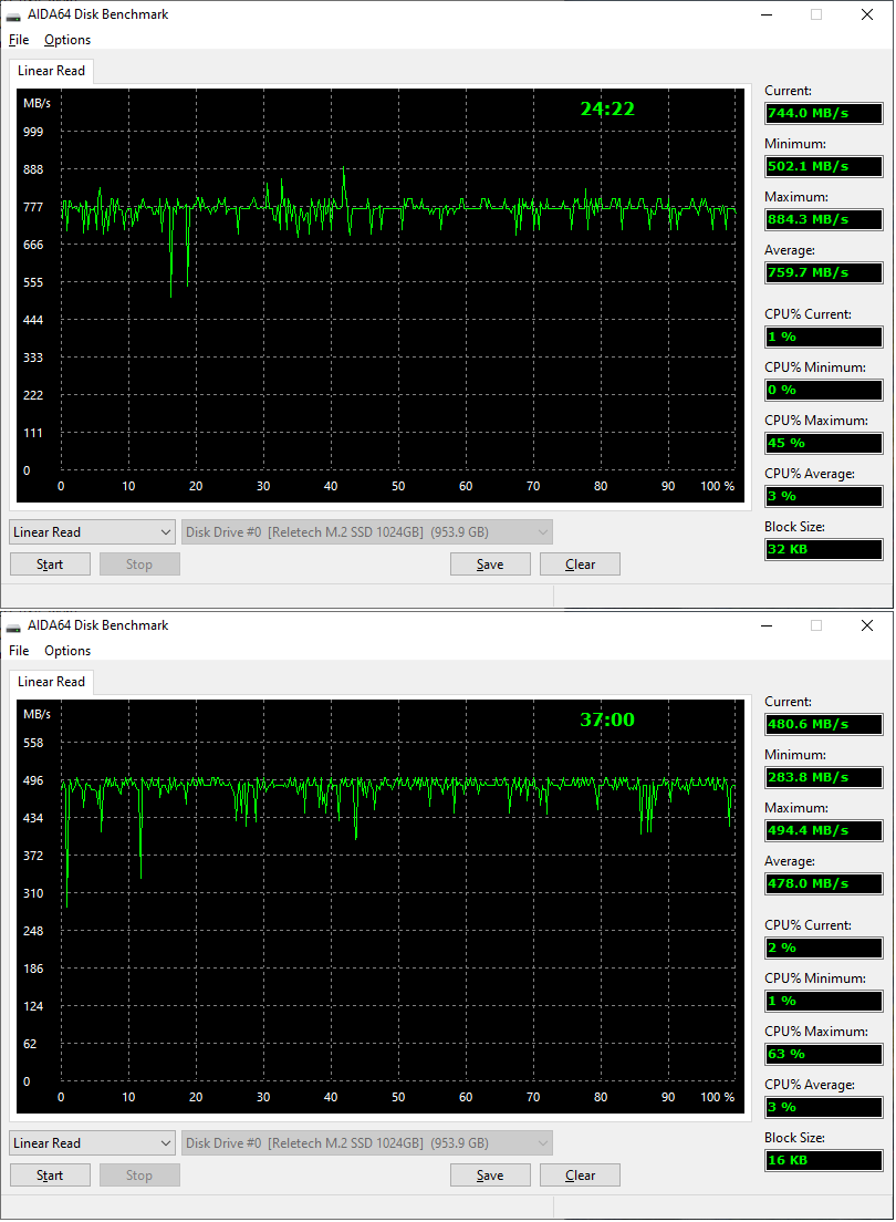 Провел несколько тестов чтения с разными размерами блоков. что-то reletech вообще не радует, особенно на мелких блоках... Зеленый - Transcend MTE220s 256Gb Желтый - Reletech P400 1024Gb Голубой - OCZ Vector150 120Gb