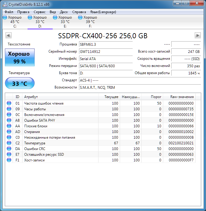 ========================================= Перед публикацией скриншотов Crystal Disk Info в меню "Сервис" >> "Дополнительно" >> "Raw-значения" выберите вариант "10 [DEC]". Это упростит восприятие информации. В меню "Сервис" ставьте галочку "Скрыть серийный номер".