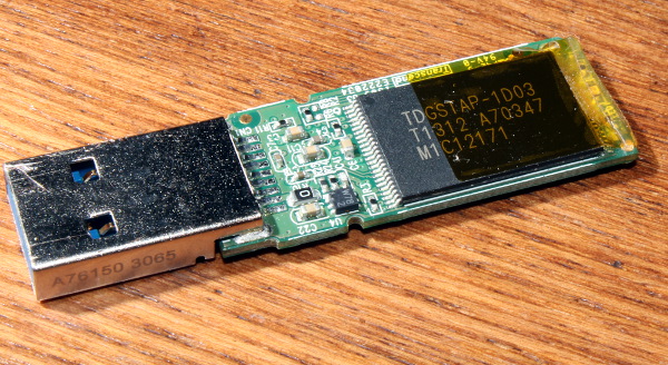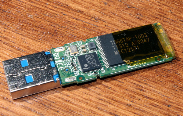 Transcend JF 810 32GB перестала нормально работать - только если втыкаешь под небольшим изгибом, симптомы соответствуют непропаю (пока мест не нашёл где). Начал разбирать и вот кому интересно - начинка.