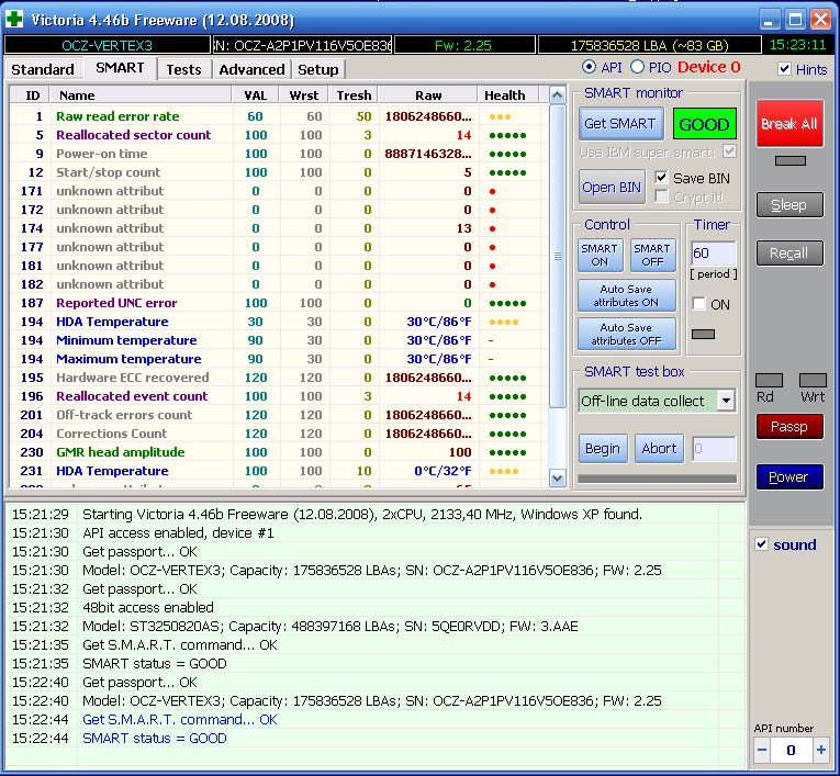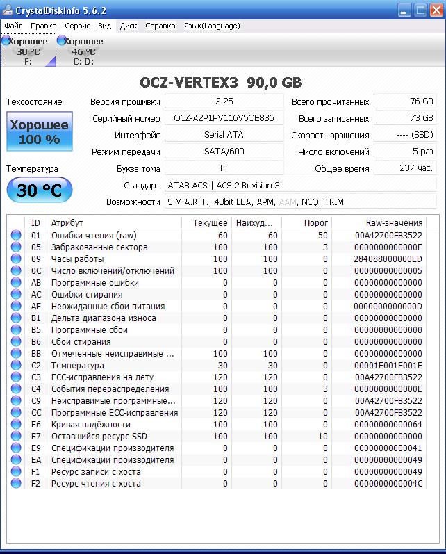 Уже писал, что мой Вертекс4 иногда пропадает из системы и биоса, и "падает" компьютер. Полгода опять поставил Вертекс4 как системный диск; теперь опять стал пропадать, лечится отключения кабелей питания и саты, ждать несколько секунд/минут. Сделал копию на другой диск SanDisk SDSSDX120GG25 - достанет - поменяю. Мистика.. p.s. СМАРТ Вертекс4 - отличный, потерь данных нет.