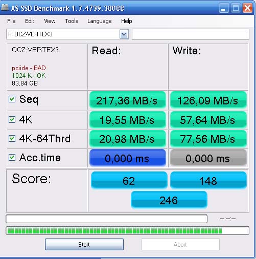 В.9. Почему у меня скорость в CrystalDiskMark ниже заявленной производителем ? О. Скорость сильно зависит от SATA контролера вашей материнской платы. На контролерах SF используйте All 0x00, 0Fill. А так же ориентироваться нужно на реальные тесты пользователей http://forums.overclockers.ru/viewtopic ... 4&t=416586 на таком же железе как у вас, ну и конечно же в обзорах .