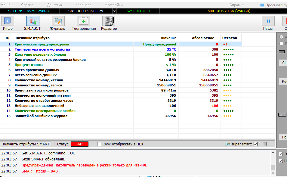 в смарте это отмечено ! на диске ничего не записывается и не удаляется !