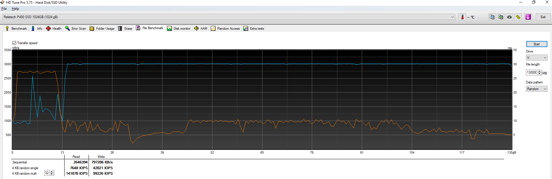aida64, версии 3.20-4.* более новые версии делают паузы, в которые ssd успевает начать раскидывать slc-буфер, отчего график превращается в пилу, но в итоге тест записи идет намного дольше. можно использовать старую простую hd speed, графика полного объема она не строит, но работает без пауз и честно рисует скорость. причем на запись можно их запустить несколько на разные диски. чтобы увидеть максимально достижимую в ПО скорость записи можно запустить fio в режиме типа --iodepth=32 --rw=write --direct=1 --numjobs=1 --name=writeonce --filename=\\.\PhysicalDrive%1 --bs=4096K --blockalign=4096K только это все деструктивные тесты - разметка и данные диска будут утеряны-перезаписаны. если ssd уже используется - наверно остается только hdtune в режиме теста файла, выбрать размер побольше, на весь свободный объем, и смотреть на график. он там обычно вполне адекватный, если указан достаточно большой объем (несколько сотен гигабайт). то есть выбрать file benchmark, data pattern <- random, file length <- скажем, 200000 (MB) в меню File|Options|Benchmark выставить размер блока 8MB.