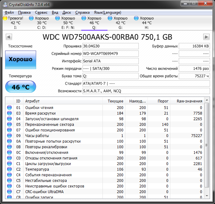 WDC WD7500AADS - WD Green 750Gb: 70 593 часов (~8 лет) Старичок Гриныч, 8 лет на благо родине, торрентов и игр Сдаваться не собирается, хоть уже и за 70 ему) Очень хочется взять сотку)