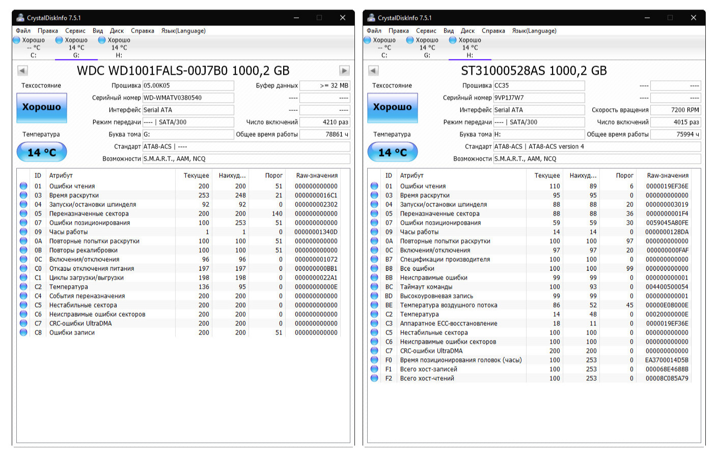 WDC WD5001AALS - WD Black 500Gb: 68 532 часов (~7,8 лет) Старичок блэкушник, долго был системным диском, а теперь ёмкость под игрули. Шумноват, хрустит как чипсы Lays.