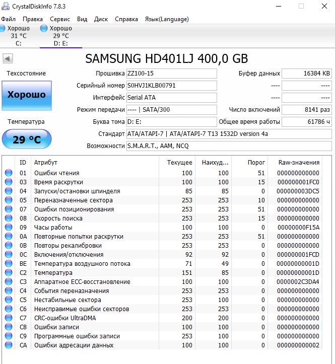 Время идет, этот диск моложе не становится, уже почти 100 тысяч часов. Бодренький. Хотя не знаю зачем я его держу. Есть еще вот такой самсунг, частично битый. Единственный из трех, который хоть как-то выжил.