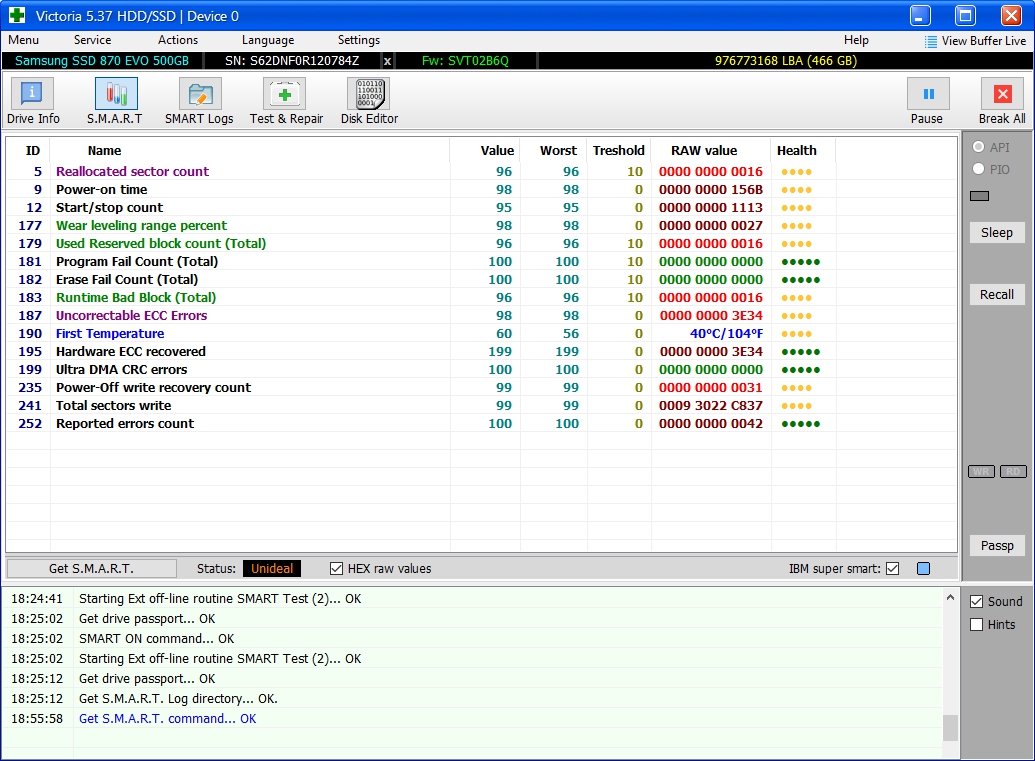 Samsung 870 EVO (77E500BW), покупал в июле 2021, сейчас обнаружил несколько нечитаемых файлов (образ диска виртуалки с Убунту, хранилище почты Outlook, базу данных одного из расширений Chrome и что-то ещё), прогоняю Викторией - несколько десятков битых секторов, 22 переназначенных. Это нормально для этой модели? #77 Прошивку обновил два дня назад, до этого была SVT01B6Q. Копировал один из этих файлов через Non-Stop Copy - картина такая: #77 Чем-то похоже на случай с SSD Teamgroup на кафедре (TeamGroup SSD массово валятся), но не в такой степени, как там.