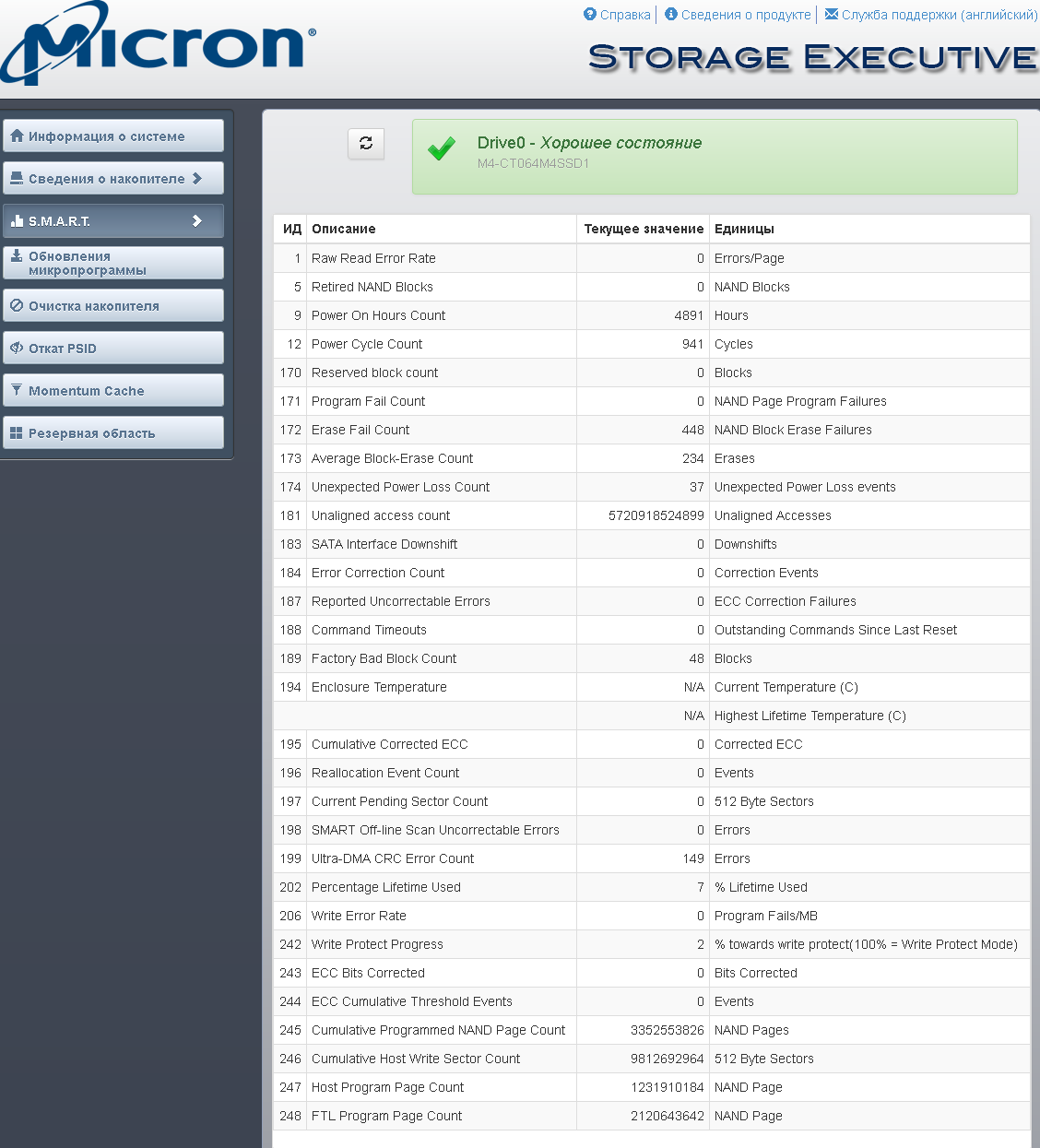 F1 - Host Writes F5 - Nand Writes плюс "Crucial Storage Executive Client" выдает "Total Bytes Written" на вкладке "Drive Details", и там же можно посмотреть смарт - последние 3-и поля по 32MB.