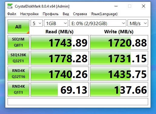 Здравстуйте. Купил ssd m2 samsung 980 pro 1tb. Через месяцок буду собирать себе новый комп с современной материнкой на pci4. А пока, ради проверки, вставил его в свой старый компуктер, в мать ASUS TUF B360-PLUS GAMING, в верхний м2 разъем. Я понимал, что скорости 7000мбс не будет, а будет в районе 3500мбс, но скорость оказалась всего 1743! Будто чтото делит пополам канал pci. Вычитал про мою мамку следующее «В связи с недостатком свободных линий слот M.2 Socket 3 («M.2_1») делит пропускную способность с одним из портов SATA 6 Гбит/с («SATA_2») при установке M.2 SATA-накопителя.» ОК, в сата2 у меня был занят другим ссд диском, переткнул его в сата5 (сата2 стал пустой). Но это не помогло, всеравно скорость у 980про 1740мбс. Пробовал его вставлять во второй (нижний) разъем м2 – не помогло, такая же низкая скорость. В биосе в гарфе «M.2_1 Configuration» стоит PCI-E, а в графе «PCIe Speed» стоит «Gen3» Может кто сталкивался с похожей проблемой? Диск брал на авито у продавйа с отличной репутацией, диску около года.