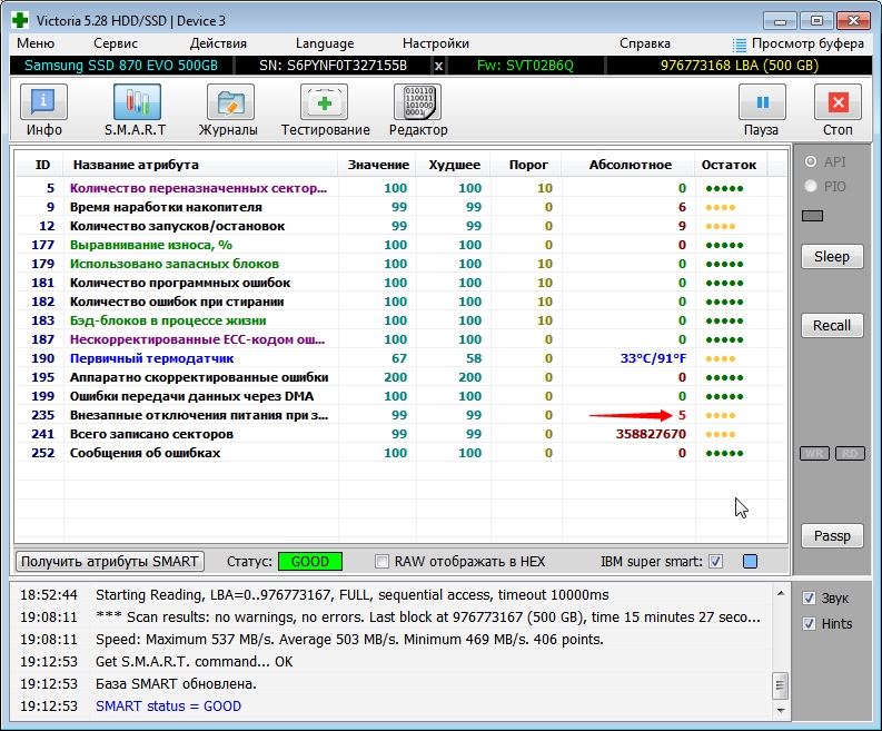 Всем привет. Ребят, подскажите по параметру "por recovery count" 870 EVO 500gb дата 2022.04.23, почитал в начале теме, но так и не понял, ктото пишет глюки, ктото что это питание. На старом диске Kingston A400 все было ок. Не питание, ни глюки - ничего не было такого, параметр работал как надо. PS. Диск оригинал, чек в Samsung Magican - в нем параметр PRC такой же как и в Victroia HDD. PSS. Но серийник почему то НЕ сработал на оф.сайте, бывает такое ? https://www.samsung.com/us/support/warranty