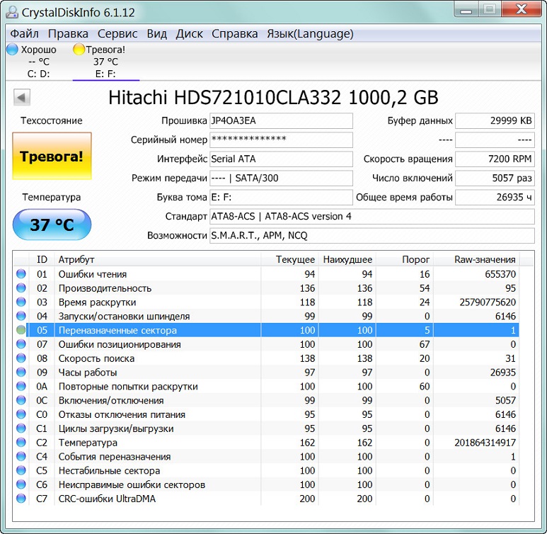 на Hitachi HDS721010CLA332, но буквально пару-тройку дней назад "битыша" точно не было, что то мало диск поработал, может 1-н сектор и не фатально? а может кто его знает... поделен на разделы 231GB под игры и 700GB для хранения файлов. наверное желательно сменить, и чем скорее тем лучше пока не потерял инфу? вопрос - как внешний для бекапа файлов еще послужит?