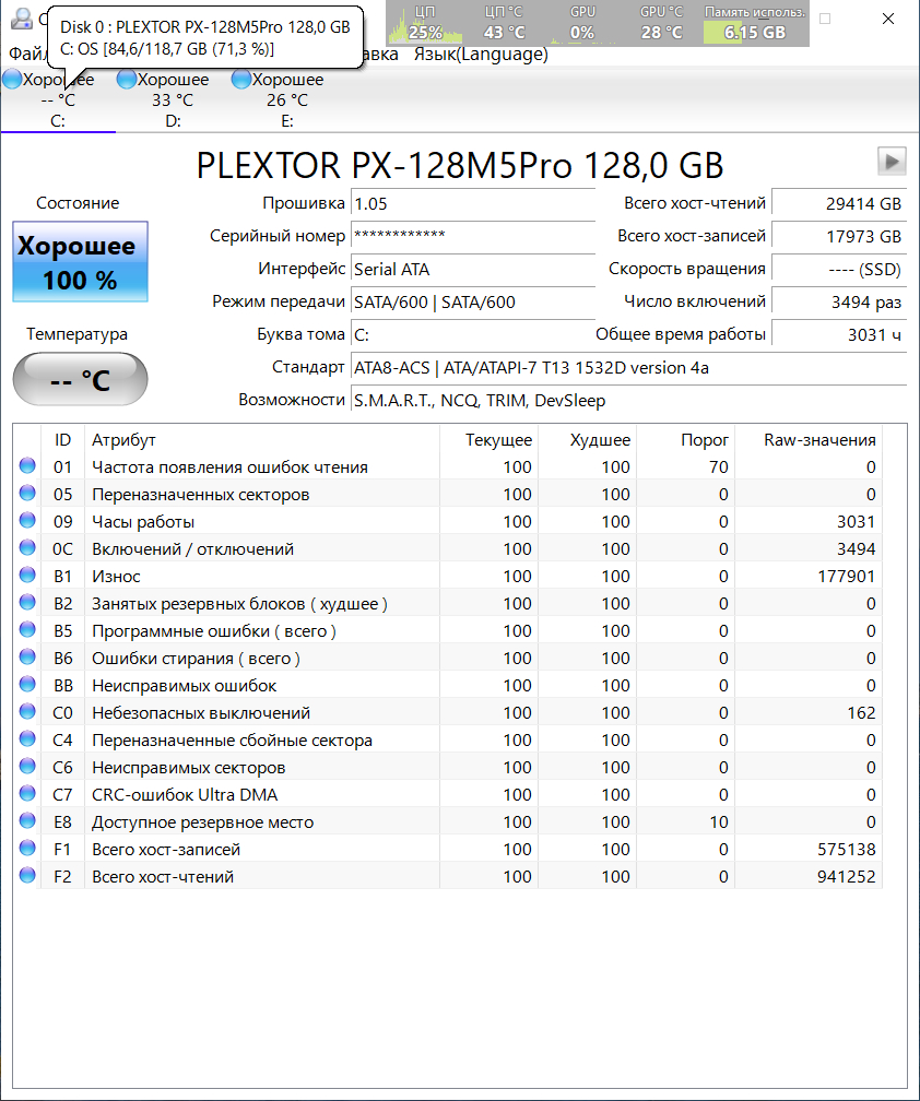 ========================================= Перед публикацией скриншотов Crystal Disk Info в меню "Сервис" >> "Дополнительно" >> "Raw-значения" выберите вариант "10 [DEC]". Это упростит восприятие информации. В меню "Сервис" ставьте галочку "Скрыть серийный номер".