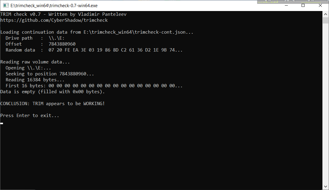 5. Для того чтобы узнать работает ли TRIM воспользуйтесь программой TrimCheck. (Проверить включена ли поддержка TRIM в ОС можно следующим образом: необходимо набрать в командной строке fsutil behavior query DisableDeleteNotify (необходимы права администратора). Если ответ будет 0, то TRIM работает и включен. Если ответ будет 1, то включить TRIM можно командой: fsutil behavior set DisableDeleteNotify 0. По умолчанию в Windows подача этой команды включена.